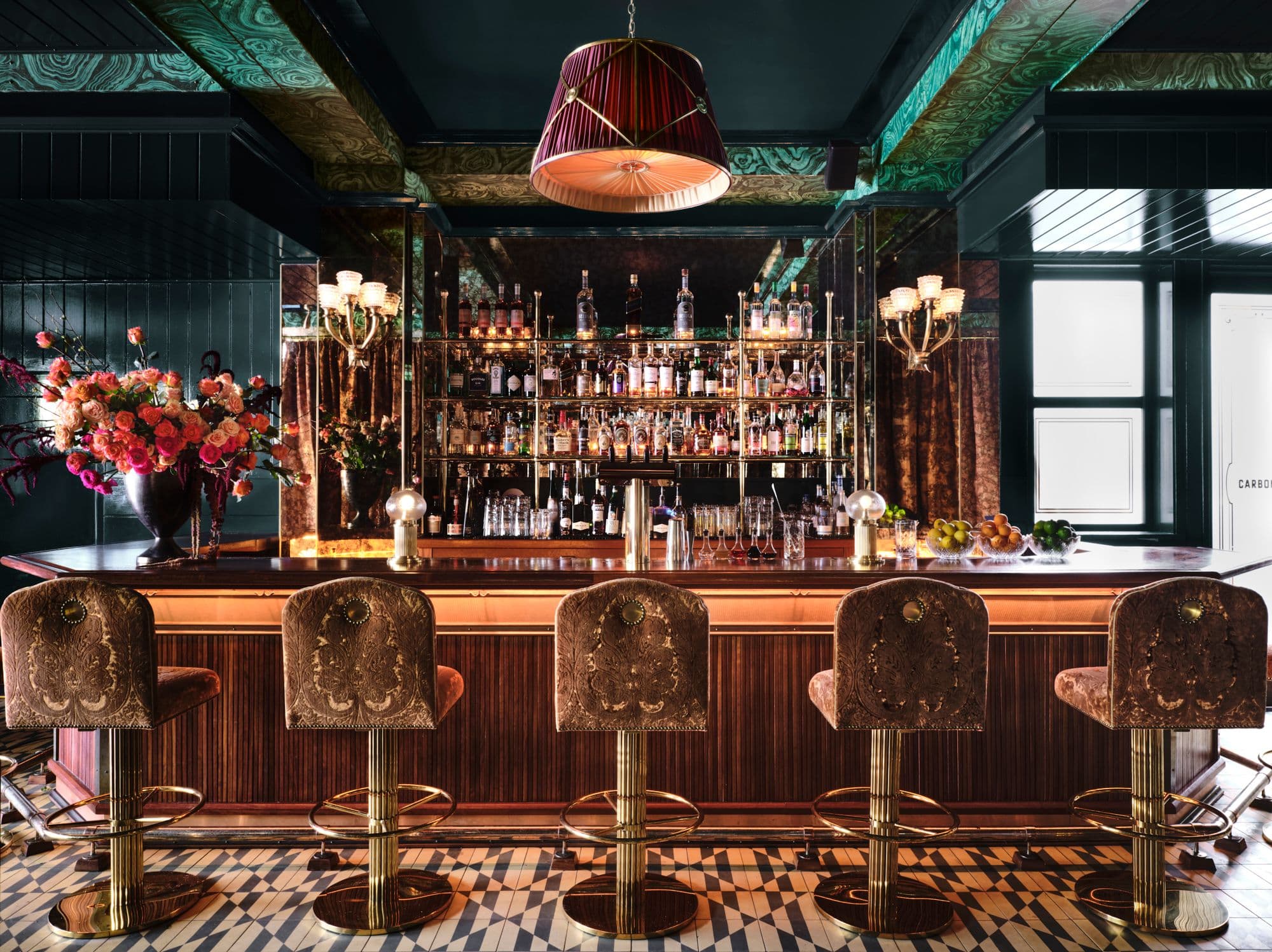 Renowned designer Ken Fulk brought the decadent color palette—terracotta, cream, rich emerald greens—to accent Carbone Miami’s Malachite ceiling beams and columns, damask-upholstered walls, and leather-upholstered banquettes and kitchen doors. Murano sconces and chandeliers add soft, glimmering light to the bar and dining areas, and Fulk’s hand-drawn wallpaper guilds the bathrooms.
